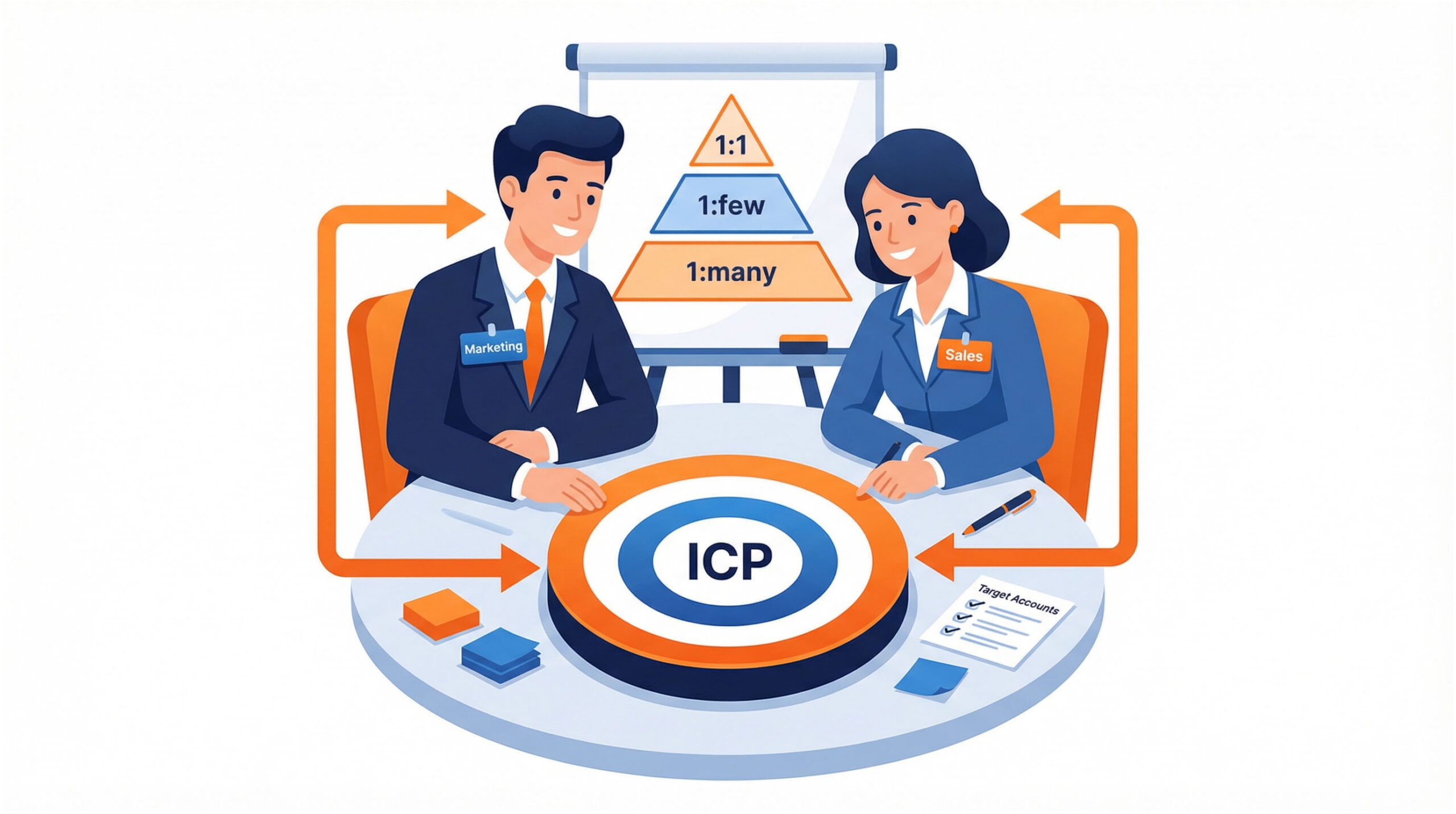 1. Accountkriterien / Accounts definieren: Wen wollt ihr als Kunden gewinnen? Hier definiert ihr glasklar, wie Euer idealer Zielkunde (Ideal Customer Profile, ICP) aussieht. Welche Branchen, Unternehmensgrößen oder Regionen (z.B. im Raum Aschaffenburg, Frankfurt, DACH) sind für Euch relevant? Das Ergebnis ist eine gemeinsam erstellte Liste von Ziel-Accounts, auf die sich alle weiteren Aktivitäten konzentrieren.