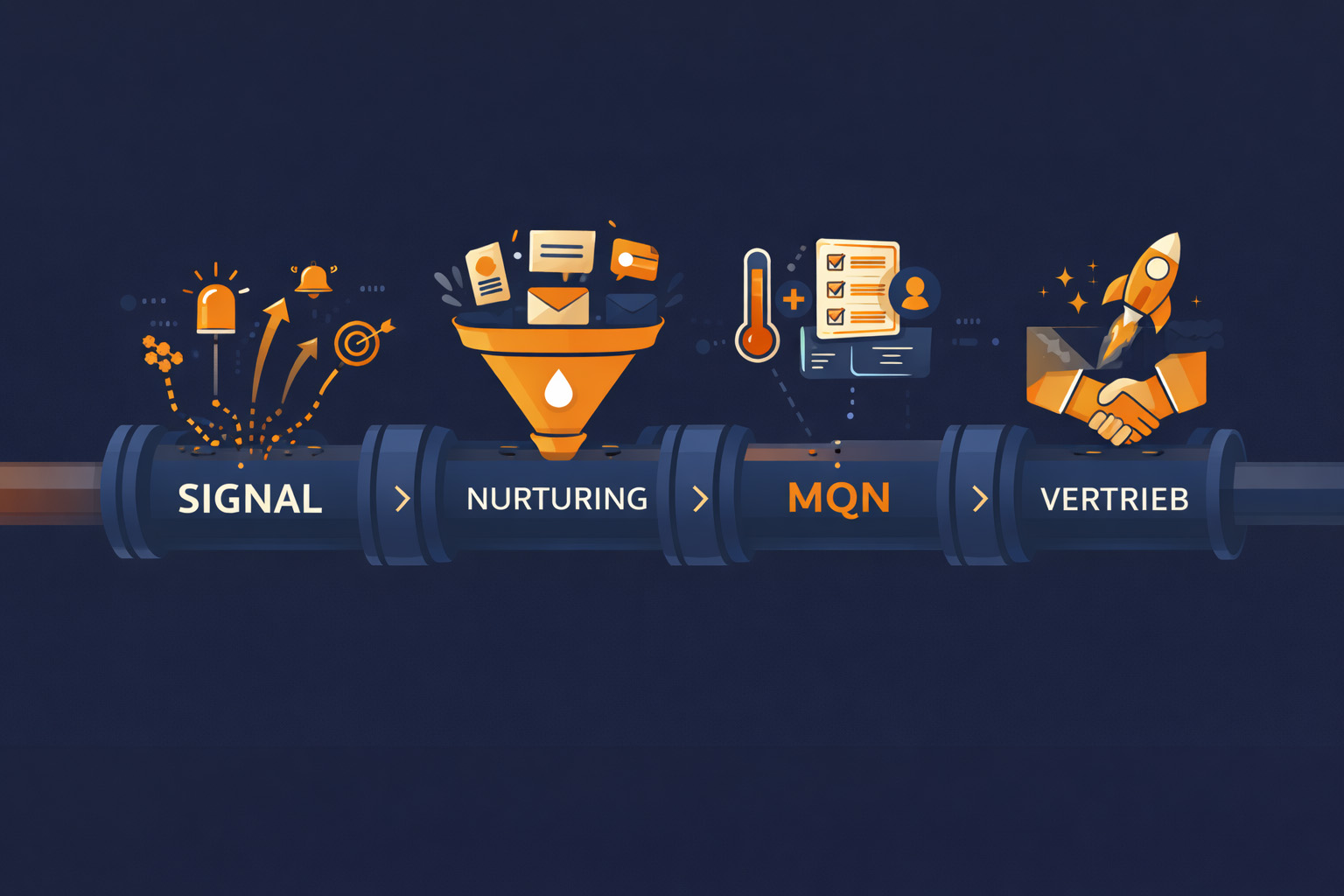 Das Schuster-Modell® zeigt diesen Prozess als Kreislauf: Signale → Nurturing → Vertrieb → Abschluss → neuer Zyklus.