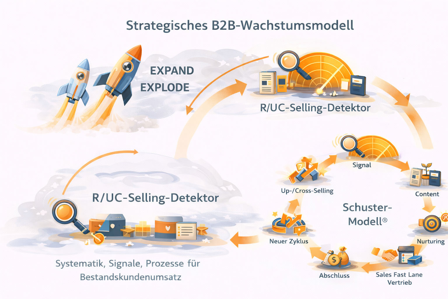Das strategische B2B-Wachstumsmodell verbindet Marktdurchdringung (Land-Expand-Explode), Bedarfsdetektion (R/U/C-Selling-Detektor) und systematische Bestandskundenentwicklung (Schuster-Modell®).