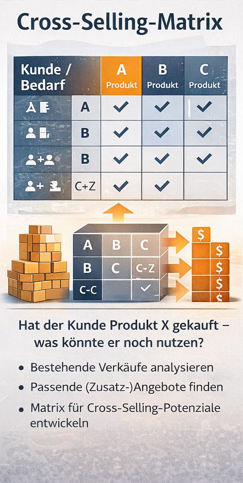 Die Infografik visualisiert eine Cross-Selling-Matrix im B2B-Bestandskundenmanagement. Ausgangspunkt sind Produkte oder Lösungen, die ein Kunde bereits gekauft hat. Die Matrix zeigt mögliche ergänzende Angebote und Erweiterungen, die als Cross- oder Up-Selling-Potenziale dienen können. Unternehmen nutzen solche Modelle, um Zusatzumsatz planbar zu machen und den Customer Lifetime Value systematisch zu erhöhen.