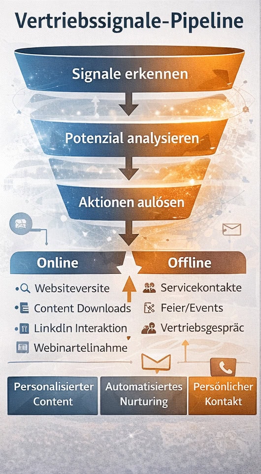 Infografik zu Vertriebssignalen im B2B: Online- und Offline-Signale wie Webseitenbesuche, LinkedIn-Interaktionen, Servicekontakte und Events zeigen potenzielle Kaufbereitschaft von Bestandskunden.