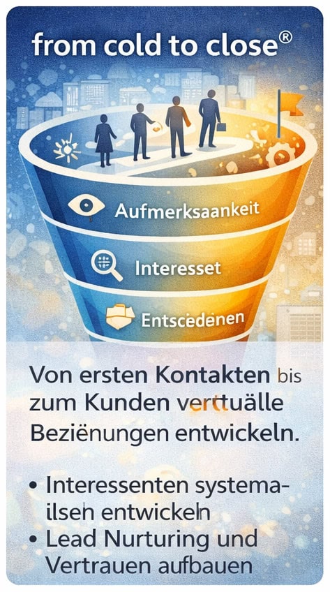 Das from cold to close® Modell beschreibt die Entwicklung von Interessenten von der ersten Aufmerksamkeit bis zum Abschluss im B2B Vertrieb.
