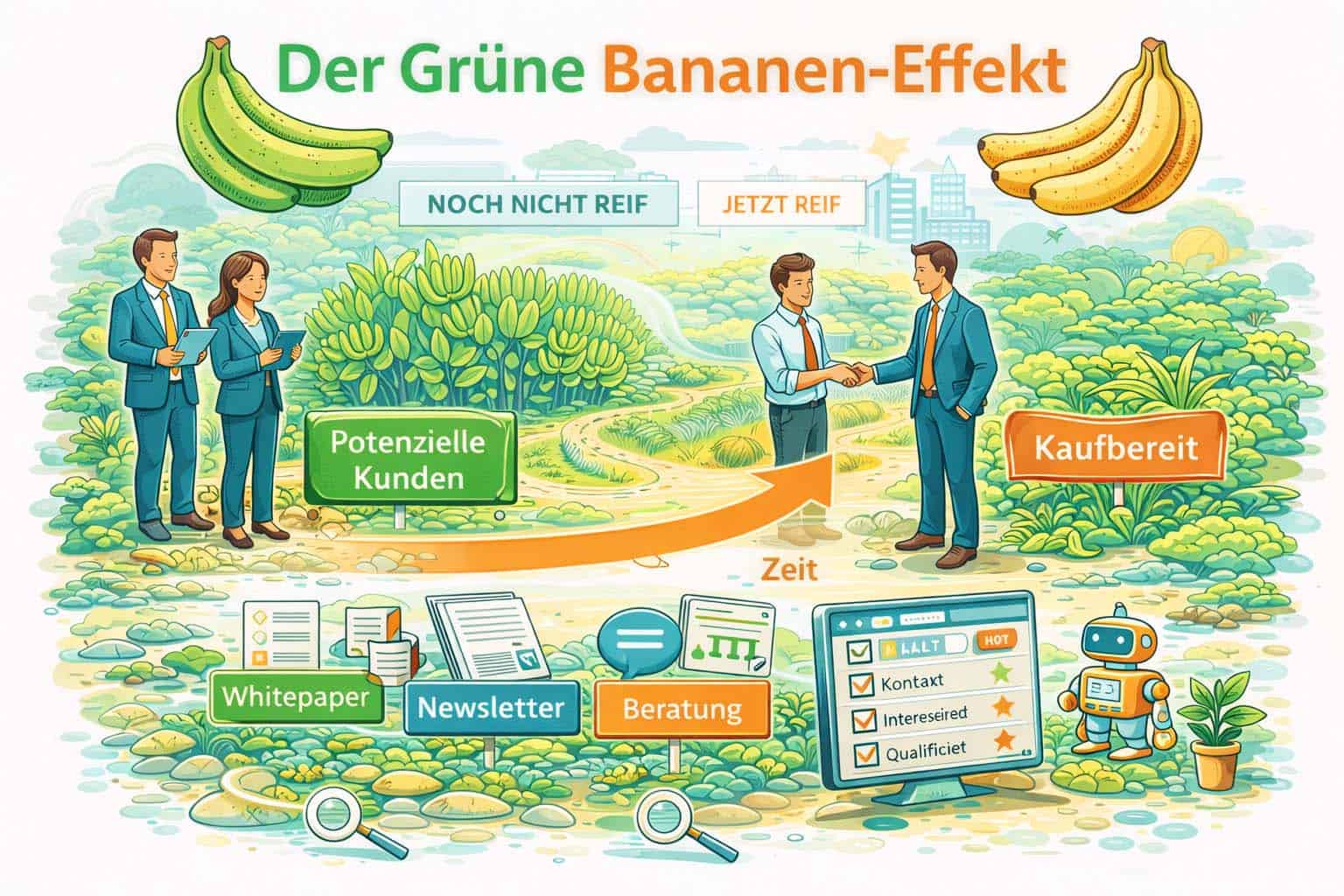 Der „Grüne Bananen Effekt“ beschreibt ein zentrales Problem im B2B-Vertrieb: Viele potenzielle Kunden sind noch nicht kaufbereit. Erst durch Content, Nurturing und persönliche Beratung werden sie Schritt für Schritt zur Vertriebsreife entwickelt.